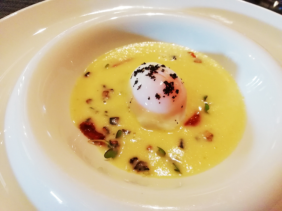 Claro que este restaurante também tem um menú degustação disponível, mas nós, mais uma vez, decidimos fazer a nossa refeição a la carte e escolher o nosso percurso gastronómico. Assim podemos recomendar sem qualquer hesitação a suave sopa de alho francês com vieira e lagostim braseados ou a mais forte sopa de cogumelos do bosque e alheira de mirandela com ovo a baixa temperatura, os deliciosos milhos à Transmontana com carne de porco Bísaro em vinha d’alhos e para finalizar o excepcional pão-de-ló da casa (que demora um pouco mais mas é tão bom e tão grande que dá para partilhar e vale realmente a espera ... aliás podem logo dizer que o querem quando escolhem o prato principal e portanto o serviço irrepreensível repara que está na hora de começar a fazer e assim não espera quase nada). Este é um almoço que é uma verdadeira refeição transmontana, com sabores do bosque, carne da montanha e técnicas tradicionais refinadas por um jovem muito talentoso, que gere a cozinha deste templo gastronómico com uma virtuosidade que dá gosto ver (sim a cozinha está aberta para a sala e toda a sinfonia e alquimia de sabores se passa em frente aos nossos olhos).